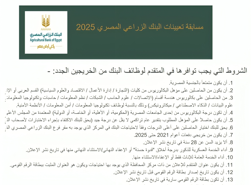 للاستفادة من هذه الفرص، يتعين على المتقدمين لمناصب البنك الزراعي المصري استيفاء بعض الشروط الأساسية. يجب أن يكون المتقدم حاصلاً على درجة علمية مناسبة في المجالات المالية أو الزراعية أو الإدارية. علاوة على ذلك، يُفضل ذوي الخبرة السابقة في القطاع المصرفي، بالإضافة إلى المهارات الشخصية مثل القدرة على التواصل وحل المشكلات. يمكن للمتقدمين زيارة الموقع الرسمي للبنك للاطلاع على الشروط والمواصفات المحددة لكل وظيفة.