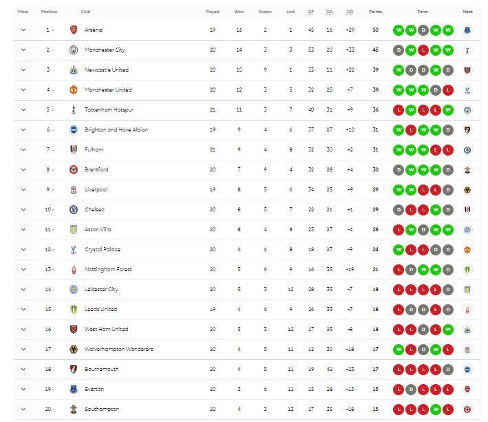 وفقاً للبيانات المتاحة، يتصدر آرسنال جدول الترتيب بعد 22 مباراة برصيد 50 نقطة من 15 فوزاً و5 تعادلات و2 خسائر، مع سجل تهديفي 40 هدفاً مقابل 14 هدفاً دخلت شباكه (+26). المنافس القريب هو مانشستر سيتي الذي يظهر بقوة أيضاً، حيث يحتل المركز الثاني بعد 23 مواجهة برصيد 46 نقطة من 14 فوزاً و4 تعادلات و5 خسائر، وسجل تهديفي 47 هدفاً و21 هدفاً دخلت شباكه (+26).