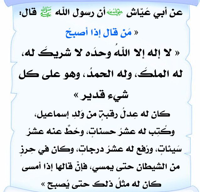 من الأدعية المأثورة في الصباح ورد عن حصن المسلم: “أَصْبَحْنَا وَأَصْبَحَ الْمُلْكُ لِلَّهِ، وَالْحَمْدُ لِلَّهِ، لاَ إِلَهَ إلاَّ اللَّهُ وَحْدَهُ لاَ شَرِيكَ لَهُ، لَهُ الْمُلْكُ وَلَهُ الْحَمْدُ وَهُوَ عَلَى كُلِّ شَيْءٍ قَدِيرٌ، رَبِّ أَسْأَلُكَ خَيْرَ مَا فِي هَذَا الْيَوْمِ وَخَيْرَ مَا بَعْدَهُ …”، كما جاء عن المستحب تكرار عبارة “لاَ إِلَهَ إِلاَّ اللَّهُ وَحْدَهُ…” مئة مرَّةٍ عند الصباح في بعض النصوص المتداولة.