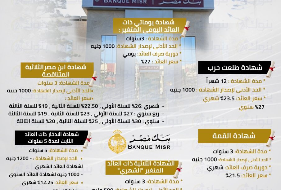 تعتبر شهادات بنك مصر من الخيارات الاستثمارية الجاذبة نظراً لعائداتها المميزة ومرونتها. مع بداية عام 2025، يستعد بنك مصر لتقديم شهادات جديدة ذات ميزات تاريخية.