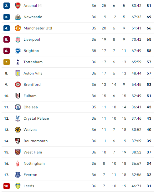 حتى بداية شهر أكتوبر 2023، تصدر مانشستر سيتي ترتيب الدوري، مع أداء قوي وهزيمة واحدة فقط منذ بداية الموسم. بينما يأتي آرسنال في المركز الثاني، متماشيًا مع الأداء الرائع الذي قدمه في المباريات الأخيرة. في المقابل، يقع مانشستر يونايتد في منتصف الترتيب، مما يعكس التحديات التي يواجهها في الموسم الحالي.