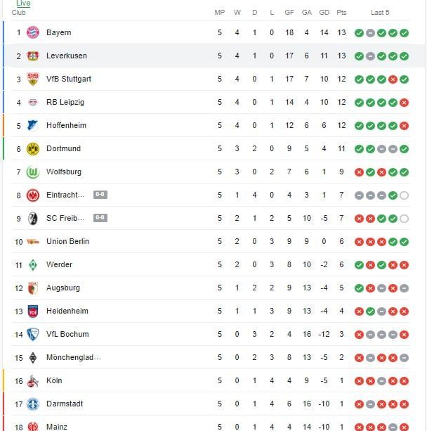 النادي الأكثر إثارة للاهتمام هذا الموسم هو نادي يونيون برلين، الذي بدأ يستقر في مراكز المقدمة. وعلى الجانب الآخر، يعاني نادي شالكه من مشاكل في تحقيق النتائج، حيث يحتل مؤخرة الترتيب برصيد 5 نقاط.