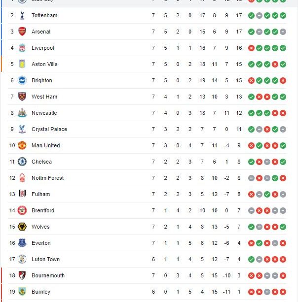 حتى تاريخ اليوم، يتصدر الدوري الانجليزي فريق مانشستر سيتي برصيد 25 نقطة بعد تسع جولات من المباريات. في المرتبة الثانية، يأتي فريق تشيلسي برصيد 24 نقطة، بينما يحتل ليفربول المركز الثالث برصيد 22 نقطة. تشمل الفرق الأخرى في المراكز الأربعة الأولى مانشستر يونايتد، الذي يحقق أداءً جيدًا في الفترة الأخيرة.