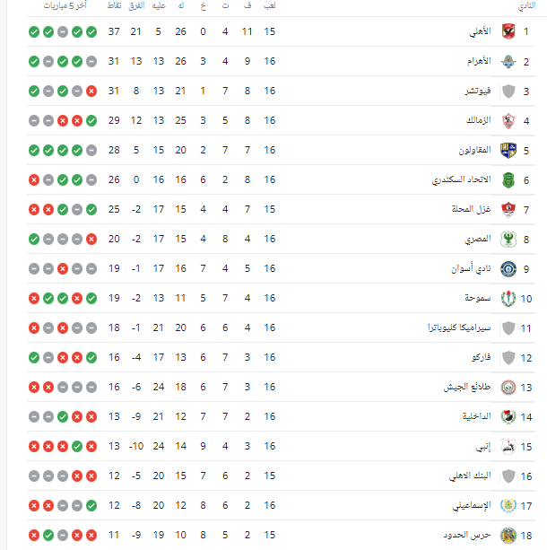 في الجولة الأخيرة من الدوري المصري الممتاز، نجحت بعض الفرق في تحقيق انتصارات حاسمة لرفع رصيدها من النقاط. حتى الآن، يتصدر النادي الأهلي ترتيب الدوري برصيد 37 نقطة بعد 15 مباراة لعبها. يليه نادي الزمالك بفارق نقطتين، حيث يمتلك 35 نقطة في نفس عدد المباريات.