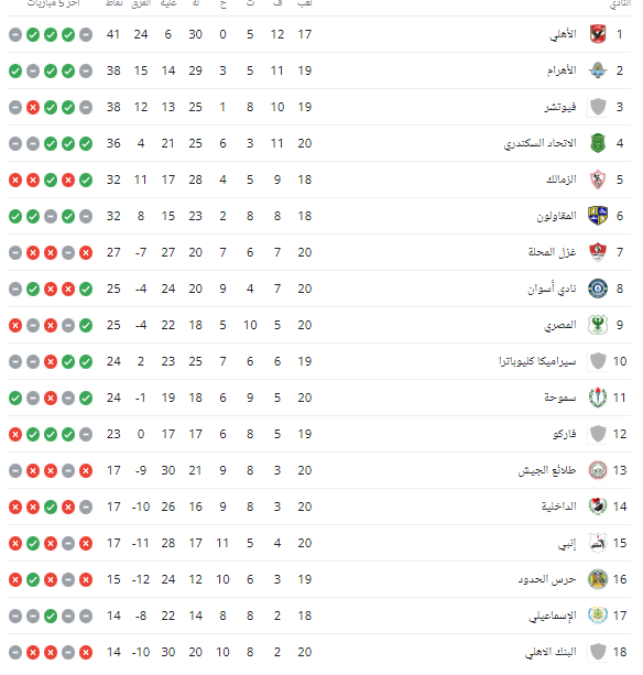 الأهلي وسيراميكا كليوباترا يلاحقان القمة برصيد 36 نقطة لكلٍ منهما. الأهلي سجل 28 هدفاً مقابل 15 دخلت شباكه (+13) بعد نحو 17 مباراة في الجدول المتوفر، في حين خاضت سيراميكا كليوباترا نحو 18 مباراة وسجلت 26 واستقبلت 13 أيضاً بفارق أهداف +13. هذا الضيق في الفارق يجعل من المباريات المتبقية محطة حاسمة لتحديد ترتيب المراكز الأولى.