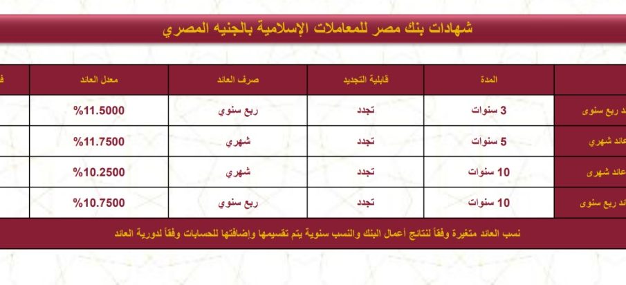 كما يقدم البنك أيضًا عوائد على الشهادات لمدة 5 سنوات تصل إلى 19%، مع إمكانية صرف العائد شهريًا، وهذا يعد خيارًا جذابًا للمستثمرين الذين يبحثون عن تدفق نقدي منتظم. تعتبر هذه العائدات مرتفعة نسبيًا مقارنة بمعدلات الفائدة في السوق، مما يجعل شهادات بنك مصر شديدة الجاذبية.
