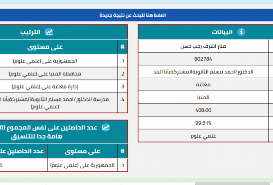 نتيجة الثانوية العامة بالترتيب على الجمهورية لعام 2023